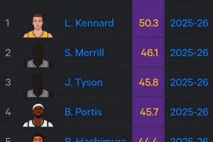 湖人本赛季有两人位居三分命中率前5:肯纳德50.3%第1 八村第5